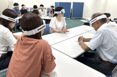 人は外界から得る情報の8割以上を視覚に頼っていると言われていますが、この研修では、アイシェードを装着し、あえてその視覚を遮断することによって、普段は無意識に依存している感覚を手放します。